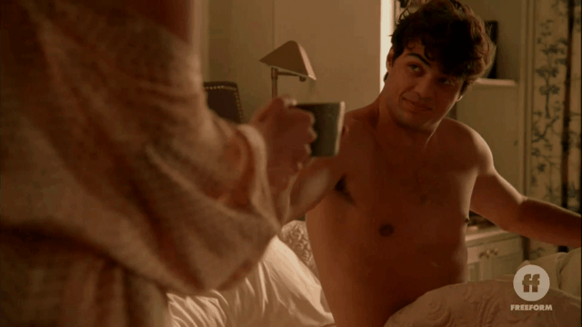 Noah Centineo made his Good Trouble debut this week and he did it with quite the bang. Literally. He hooked up with Callie's (Maia Mitchell) coworker, Becca (Molly McCook), and his very first scene featured him shirtless, lounging in Becca's bed while she brought him coffee.